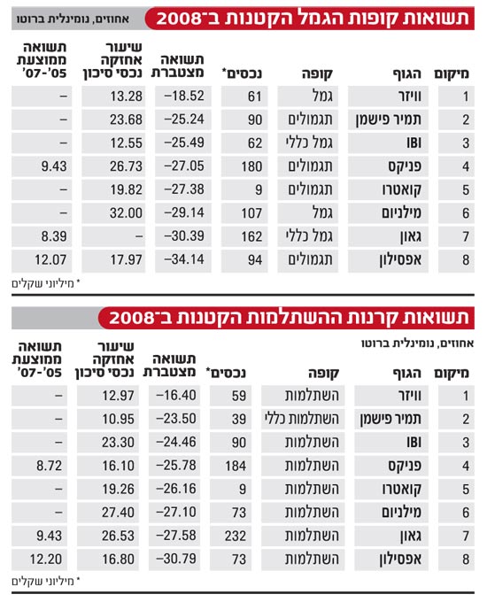 למעט וויזר, כל המנהלים הקטנים לא הצליחו להכות את ביצועי השוק, והתשואות שהם הציגו נעו בין 23%- ל-34%-. במקום השני נמצאת קופת הגמל של תמיר פישמן, המנהלת 90 מיליון שקל, וסיימה את השנה עם תשואה שלילית של 25.24%. תמיר פישמן לא הצליח לפרוץ קדימה עם קופות הגמל שלו בשנות הגאות, ולאחר ארבע שנות פעילות הוא נותר עדיין עם פחות מחצי מיליארד שקל נכסים מנוהלים.