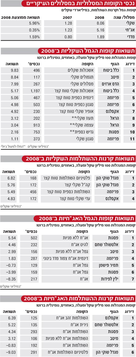 11 קופות גמל שקליות מנהלות מעל 100 מיליון שקל, ושלוש מהן החלו לפעול במהלך 2008. אלו קופות הלהיט של המחצית השנייה של 2008: קופות סולידיות, המבטיחות לעמיתים שקט נפשי וביטחון שלא יפסיד. הגדולה שבהן היא אשכולות שקלי טווח קצר של כלל ביטוח, המנהלת 1.2 מיליארד שקל, לאחר שמאז אוקטובר צברה 1.06 מיליארד שקל. רק בדצמבר נוספו לקופה 500 מיליון שקל.