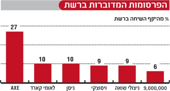 הפרסומת של AXE לג'ל רחצה לגברים היא הפרסומת המדוברת ביותר השבוע ברשת עם 24% מהיקף השיחה על פרסומות ברשת. במקום השני, הרחק מאחור, ממוקמים הקמפיינים של לאומי קארד 'גרוזינים', ניסאן 'רכב מנהלים', ויסוצקי והקמפיין למען ניצולי השואה. כל אחד עם 9%-10% מהיקף השיחה על פרסומות ברשת. כך עולה מנתוני חברת Twisted Fly.