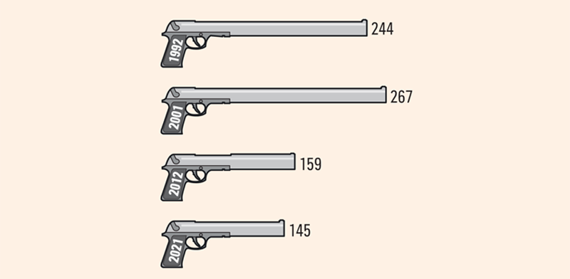 בשנת 1992, במהלך האינתיפאדה הראשונה, היו רשומים בישראל כ־244 אלף כלי נשק אזרחיים ברישיון. כמעט עשור לאחר מכן, בזמן האינתיפאדה השניה ב־2001, המספר עלה לכ־267 אלף. אך מאז האינתיפאדות ועד היום גברה תחושת הביטחון האישי והחלה ירידה משמעותית במספר הנשקים הפרטיים. ירידה שנמשכת עד היום. ב־2021 מספר כלי הנשק הפרטיים צנח ל־145 אלף. בכל אותה תקופה, חשוב לציין, היה גידול באוכלוסיה, כך של־4.75% מהאוכלוסיה היה רישיון ב־1992, וב־2021 מדובר על 1.5% בלבד.