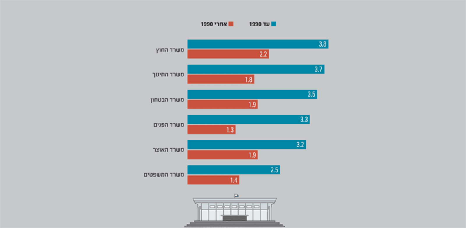 אם לפני 1990 שר חינוך השלים קדנציה ממוצעת של 3.7 שנים, מאז הקדנציה הממוצעת התקצרה ביותר מחצי. גם משך הכהונה של שר הביטחון הצטמצם משמעותית. שנת 1990 משמשת כנקודת המפנה, משום שהחל ממנה יציבות הממשלות התערערה. עם זאת, ניתן לראות יציבות גדולה יותר במשרדים שבאופן מסורתי יש עליהם קוצנזוס ויש מועמד "מתבקש" לתפקיד. גם במשרד האוצר קיימת יציבות יחסית מכיוון שהשר צריך להעביר תקציב למספר שנים.