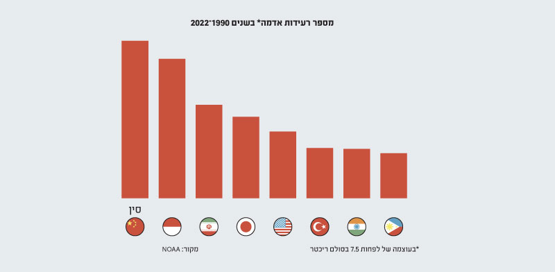 סין נמצאת במקום הראשון ב־32 השנים האחרונות, עם 182 אירועי רעידת אדמה. טורקיה, שחוותה השבוע רעידת אדמה בעוצמה של 7.8, נמצאת במקום השישי ברשימה. בישראל, רעידת האדמה האחרונה בסדר גודל כזה התרחשה ב־1927, ונהרגו בה כ־287 איש.