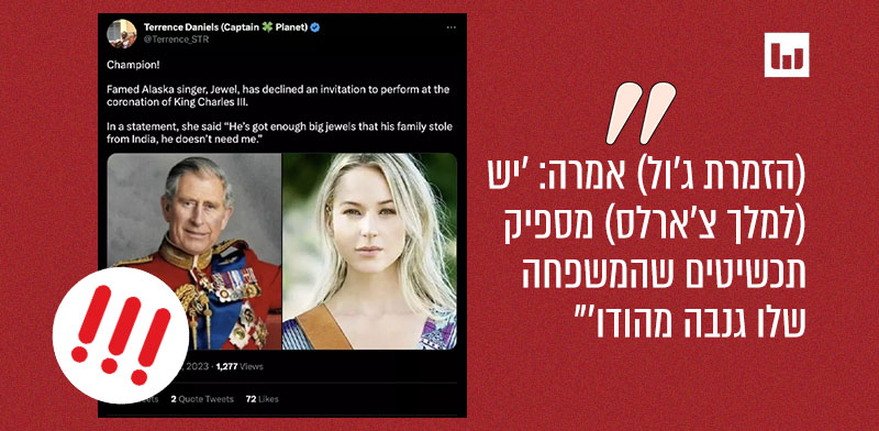 היהלום שבכתר. נמשיך עם פייקים שקשורים לאמנים ולמסיבת ההכתרה, אבל הפעם מהודו. האם הזמרת האמריקאית ג'ול (Jewel, תכשיט) סירבה להופיע במסיבה בגלל חלקים בעייתיים בהיסטוריה של בריטניה? פוסטים ויראליים בטוויטר ובפייסבוק טענו שכן: "בהצהרה היא אמרה: 'יש לו מספיק תכשיטים גדולים שהמשפחה שלו גנבה מהודו, הוא לא צריך אותי'". הסוגיה עצמה - חפצים יקרי ערך מרחבי העולם כמו עתיקות יהלומים ועוד, שנמצאים כיום בבריטניה - היא אכן טעונה. אבל בודקי העובדות של הארגון ההודי Boom לא מצאו שום ראיה שהייתה איזושהי הודעה כזו מצדה של הזמרת ג'ול. הם פנו גם לזמרת לצורך תגובה, אבל זו לא התקבלה.