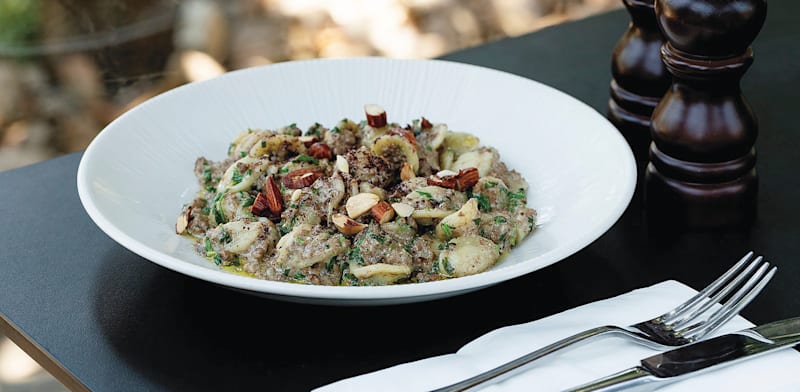 מנה נהדרת נוספת שמחברת בתבונה בין דרום איטליה למזרח התיכון. ההשראה למנה היא מנסף, תבשיל בדווי-ירדני, המוגש באירועים מיוחדים ובחגים: קוביות כבש מבושלות במרק יוגורט (ג'מיד), מוגשות על בורגול או אורז עם שקדים קלויים וצנוברים. במטבח של רוברטה הפך המנסף למנת פסטה (בדרך כלל אורקייטה - פסטה בצורת תנוך של אוזניים האופיינית לפוליה) עם ראגו של בשר ושומן טלה והמון בצל מטוגן, יוגורט צאן ותבלינים (הל, קינמון, פלפל אנגלי, סומאק). היא מוגשת עם שקדים קלויים ושמן זית. טעים טעים טעים.