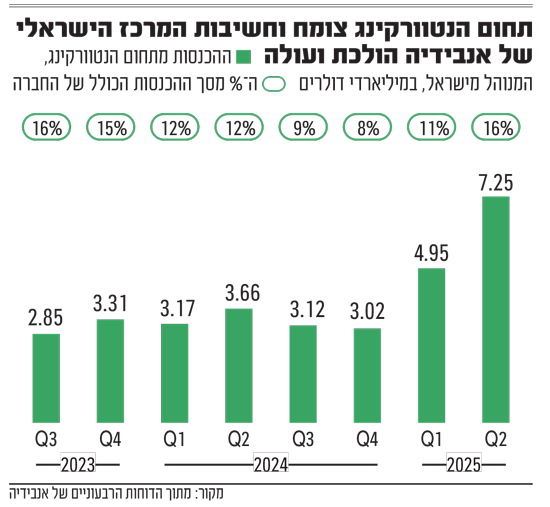מי שזינק מרבעון לרבעון בצורה המרשימה ביותר מבין כל הפעילויות של אנבידיה (למעט פעילות ה-OEM הזעירה) היא לא אחרת מאשר אנבידיה ישראל - מלאנוקס לשעבר - עם עלייה של 46% מרבעון לרבעון, וקרוב ל-100% משנה לשנה עם מוצרי מעבדי ושרתי התקשורת (נטוורקינג) של אנבידיה. הכנסות פעילות הנטוורקינג של אנבידיה עלו מ- 3.66 מיליארד דולר ברבעון המקביל אשתקד, או כ-5 מיליארד דולר ברבעון הראשון של השנה ל-7.25 מיליארד דולר ברבעון השני השנה - סכום שמגלם כבר קצב הכנסות שנתי שיכול לנוע אי שם בין הכנסות של 25 ל-30 מיליארד דולר בשנה. סכום מרשים לכל הדעות עבור חברה שנרכשה ב-6.9 מיליארד דולר בתחילת העשור.