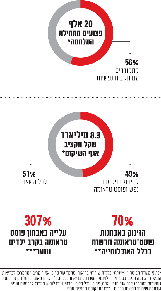 דוח של תוכנית "מטפלים בנפש" של חברת טבע מצא כי 47% מהציבור מדווחים על הרעה במצבם הנפשי מאז 7.10 אך רק 50% מהמעוניינים בטיפול נפשי קיבלו אותו. 41% מהמטפלים מעידים שהמטופלים שלהם אינם מקבלים מספיק טיפולים. חברת הקנאביס הרפואי סאיקי מצאה בסקר שערכה שכמחצית מהישראלים מכירים אדם שסובל מפגיעה נפשית בעקבות טראומה.