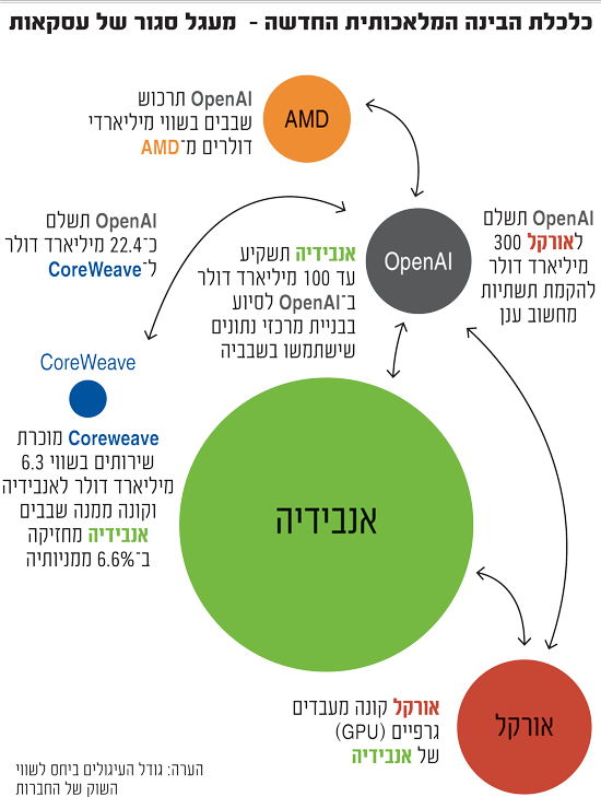 אנבידה עצמה מהווה כוח מרכזי שמניע את אותה רשת קשרים סבוכה. עסקת הענק של אנבידיה עם OpenAI מדגימה כיצד המימון ההדדי בתעשייה מתחיל להיראות "כמו לולאה סגורה", כלומר, לפי בלומברג מצב שבו ספקית החומרה החשובה בעולם הופכת גם לגורם שמזין את הניפוח הפיננסי של הלקוחות שלה.
