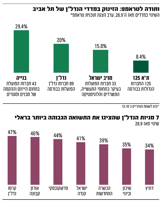 מאז פרסום התוכנית, שהתגבשה לעסקה לסיום המלחמה והחזרת החטופים, זכו מניות חברות הנדל"ן לחיבוק חם מצד המשקיעים המקומיים. במהלך שבעת ימי המסחר שחלפו מאז, ערב ההכרזה על התוכנית (28 בספטמבר) אז כבר החלה הבורסה לזנק בציפייה להסכם, קפץ מדד הנדל"ן של תל אביב בכ־20%, מדד הבנייה הגדיל ועלה בכ־30%, ואילו מדד מניב ישראל "הסתפק" בעלייה של כ־16%. זאת בזמן שמדד הדגל ת"א 125 עלה "רק" בכ־8%. ועדיין, מתחילת השנה מדדי הנדל"ן עדיין מפגרים ביחס למדדים המובילים עם עלייה של 26% במדד הנדל"ן וכ־20% במדד הבנייה. זאת, ביחס לעלייה של כ־36% במדד הדגל ת"א 125.