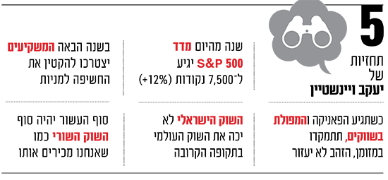 "היום מדד S&P 500 נמצא בסביבות 6,500 נקודות, ושנה מהיום אני יכול לראות 7,500, כלומר עלייה של כ-15%" (נציין כי מאז השיחה עם ויינשטיין השוק האמריקאי המשיך לעלות, נ"א). זה אומר שנגיע למכפיל רווח עתידי של 25 במדד, שזה הטופ שבטופ, שיש בו הצדקה כלכלית לשבת על מניות. לאור ניסיון העבר, זהו זמן להקטין חשיפה לשוק, כי ברמות של מכפיל 25 אתה מותח את החבל יותר מדי. זה לא אומר שאי אפשר למתוח עוד, אבל זה עלול להיות יותר מדי".
