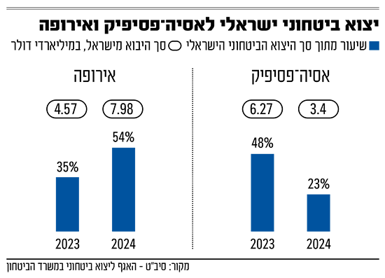 הסיפור שמוצג בשטח משתקף גם מנתוני סיב"ט (האגף ליצוא ביטחוני), כי בעת שאשתקד חלה צמיחה כוללת של 11.7% ביצוא ל־14.795 מיליארד דולר, שיעורה של אירופה זינק מ־35% ב־2023 ל־54%. עם זאת, מי שחלה ירידה מהותית ביבוא שלה מישראל היא זירה אחרת שנמצאת במרוץ חימוש: אסיה־פסיפיק. המרחב שחושש מסין, צנח מ־48% ל־23%, או בסכומים - מ־6.27 מיליארד דולר ל־3.4.
