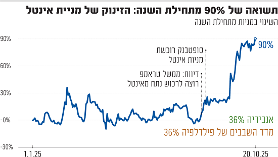 מתחילת השנה רושמת מניית אינטל צמיחה מרשימה של 90%, תופעה שלא נראתה בחברה לפחות מאז שנות הקורונה שבהם רבים רכשו מחשבים כדי לעבוד מהבית בזמן הסגרים. למעשה, מי שרכש את המניה בתחילת ינואר, נהנה מתשואה עודפת כמעט על כל חברת שבבים. אנבידיה עלתה באותה התקופה בכ־35%, ברודקום ב־50% ומארוול בכלל ירדה ב־22%. רק AMD נהנתה מזינוק חד יותר מזה של אינטל בשל עסקת ענק עם OpenAI בתחילת החודש.