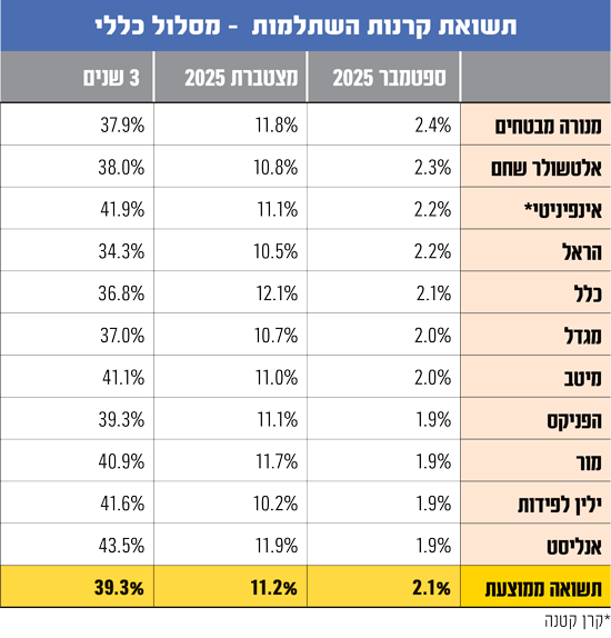 בבית ההשקעות אלטשולר שחם יכולים להיות מרוצים בחודש ספטמבר, גם בקרנות הפנסיה, שם הם הצליחו לטפס למקום הראשון ולספק תשואה של 2.95%. כך, הם עקפו את מנורה מבטחים, שסיפקה תשואה של 2.86%. בתחתית הטבלה, נמצאות הפניקס ואינפיניטי עם תשואה של 2.3% ו-2.2%, בהתאמה.
