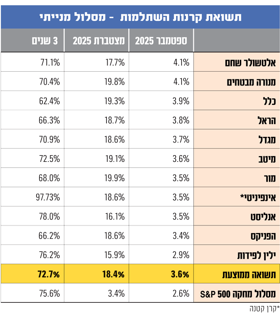 במסלולים המנייתיים, השיגו החוסכים בחודש ספטמבר תשואה חזקה של 3.6%, שמצטברת ל-18.4% מתחילת השנה ולא פחות מ-70% במהלך שלוש השנים האחרונות. לשם השוואה, החוסכים במסלולים מחקי מדד ה-S&P 500 סובלים משנה חלשה, בעקבות התחזקות השקל מול הדולר של יותר מ-9%. התשואה בחודש ספטמבר הסתכמה אמנם ב-2.6%, אך מתחילת השנה, היא עומדת על 3.4% בלבד. עם זאת, בהסתכלות לטווח של שלוש שנים, עדיין המסלול האמריקאי מכה את מסלולי המניות, עם תשואה של 75.6% בממוצע.
