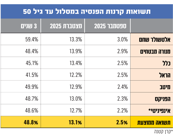 התשואה הממוצעת של גופי הפנסיה הייתה טובה גם היא בחודש ספטמבר. בממוצע, רשמו גופי החיסכון במסלול עד גיל 50 עלייה של 2.5% במהלך החודש. מתחילת השנה, רשמו החסכונות עלייה מצטברת של 13.1%, ובשלוש השנים האחרונות נרשמה תשואה של קרוב ל-50%.
