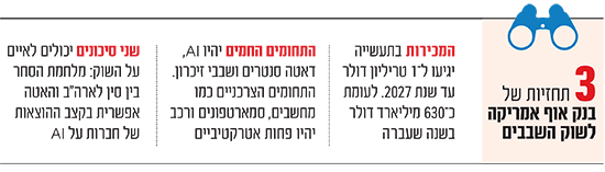 בסך הכול מעריכים כלכלני הבנק שתחומי הבינה המלאכותית (AI) השונים יגדלו משיעור של 22.1% מהמכירות ב־2024 ליותר משליש מהמכירות ב־2027. במקביל, שוק ציוד השבבים יצמח בשנים הקרובות מכ־105 מיליארד דולר ב־2024 עד קרוב ל־138 מיליארד דולר ב־2027. נזכיר ששוק זה כולל בין היתר את החברות הישראליות נובה וקמטק, שמייצרות ציוד לבדיקת תהליכי הייצור של שבבים.