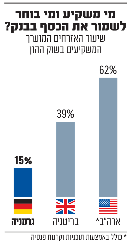 התמונה עודנה רחוקה מהמצב בארה"ב או בישראל אבל הגרמנים מצמצמים פערים, וכשמדובר באחת הכלכלות הגדולות בעולם, יש הרבה כסף גרמני שמחפש אפיקי השקעה. העובדה שהמדד הגרמני המוביל, דאקס, עלה בשנה האחרונה בכ־22%, ממש קרוב לבית, אפילו בעוד הכלכלה מדשדשת, מושכת גרמנים רבים לשוק.