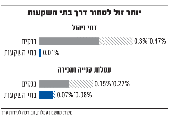 בקטגוריית דמי הניהול, בבתי השקעות כמו מיטב, אקסלנס ואי.בי.אי, תשלמו בין 0.011% ל-0.013%, ואילו בבנקים תשלמו עמלות שמגיעות גם לפי 25 ויותר בבנקים הגדולים (0.3% בבנק לאומי ועד 0.466% בבנק הבינלאומי). במילים פשוטות, על כל מיליון שקלים בחשבון המסחר תשלמו בבנקים דמי ניהול של 3,000-4,700 שקלים ואילו בבתי ההשקעות רק 100-200 שקלים.