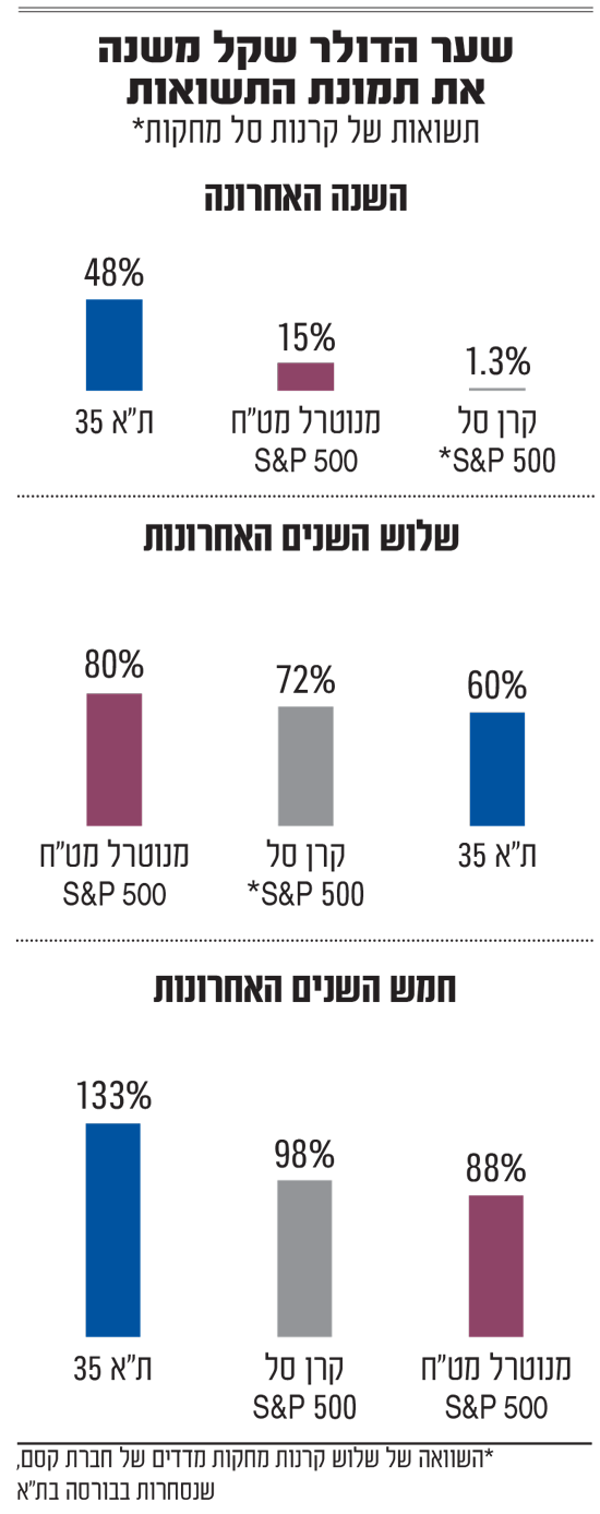 כדי להימנע מהמקרה הזה, המשקיעים יכולים לבחור בקרנות מנוטרלות מט"ח (בקרנות נאמנות, בקרנות ההשתלמות אין אפשרות של ניטרול מט"ח). הקרן מגדרת את השפעת השער המטבעי, אך גוזרת גם עלויות עבור המאמץ. כך, קרן סל מנוטרלת מט"ח שעקבה אחרי המדד רשמה בשנה החולפת תשואה של 14%, לעומת תשואה של 15.6% ב־S&P 500. מדובר לרוב בחוזים עתידיים שצריך "לגלגל", קרי לרכוש מדי כמה חודשים, כדי שינטרלו את השפעת המטבע על המשקיעים בקרן. למען ההוגנות, במבט רחוק יותר של חמש שנים, המצב משתנה משום שתנודת המטבע פחות משמעותית. מדד s&p 500 כמעט הכפיל את עצמו (93%+) וקרנות מנוטרלות מטבע רשמו בין 78% ל־83% (עלות הנטרול הולכת ומצטברת על פני שנים). בזמן שהקרנות המחקות רשמו תשואה בסביבות 103%. זאת הודות להתחזקות הדולר מול השקל באותה תקופה.