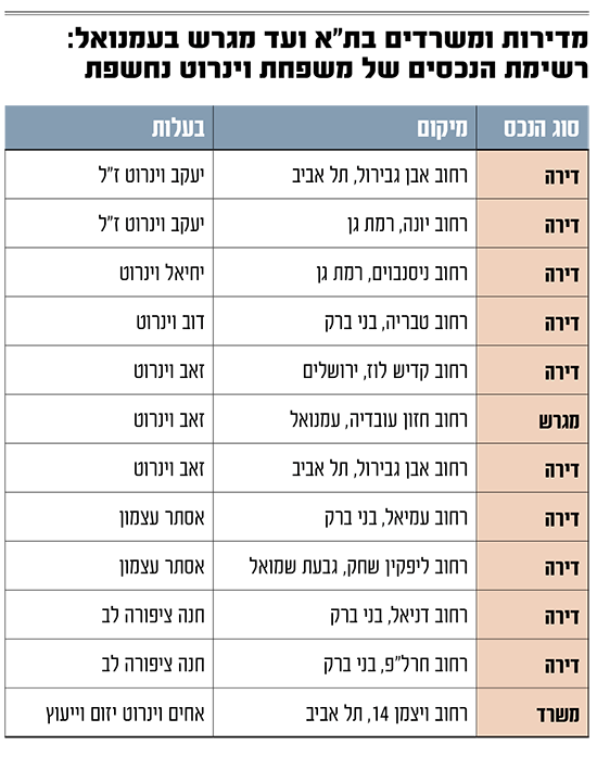 לפניכם הרשימה המלאה: דירה ברחוב אבן גבירול בתל אביב, בבעלות יעקב וינרוט ז"ל; דירה ברחוב יונה ברמת גן, גם היא בבעלותו של עורך הדין המנוח; דירה ברחוב ניסנבוים ברמת גן, בבעלות יחיאל וינרוט; דירה ברחוב טבריה בבני ברק, בבעלות דוב וינרוט; דירה ברחוב קדיש לוז בירושלים, בבעלות זאב וינרוט; מגרש ברחוב חזון עובדיה, עמנואל, הרשום על שם זאב וינרוט; דירה נוספת ברחוב אבן גבירול בתל אביב, בבעלות זאב וינרוט; דירה ברחוב עמיאל בבני ברק, על שם אסתר עצמון; דירה ברחוב ליפקין שחק בגבעת שמואל, גם היא על שם בתו אסתר עצמון; דירה נוספת בבני ברק, ברחוב דניאל, הרשומה על שם חנה ציפורה לב; דירה ברחוב חרל"פ בבני ברק, גם היא על שמה של חנה ציפורה לב; וכן משרד בבעלות חברת "אחים וינרוט יזום וייעוץ", ברחוב ויצמן 14 בתל אביב.