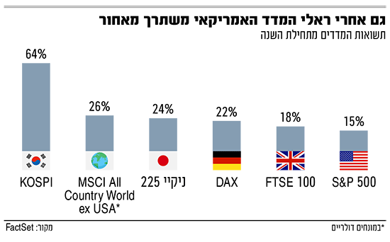 מדד MSCI All Country World ex USA, העוקב אחר מניות של שווקים מפותחים ומתעוררים, עלה בכ־26% בשנת 2025 עד כה במונחים דולריים. זאת לעומת העלייה במדד S&P 500, של 15% - הביצועים השנתיים החלשים ביותר של מדד הדגל האמריקאי מאז 2022. בתקופה זו זינק מדד קוספי של דרום קוריאה ב־64%, מדד DAX הגרמני עלה ב־22%, הניקיי 225 ביפן טיפס ב־24% ומדד FTSE 100 (פוטסי) בבריטניה עלה ב־18%.