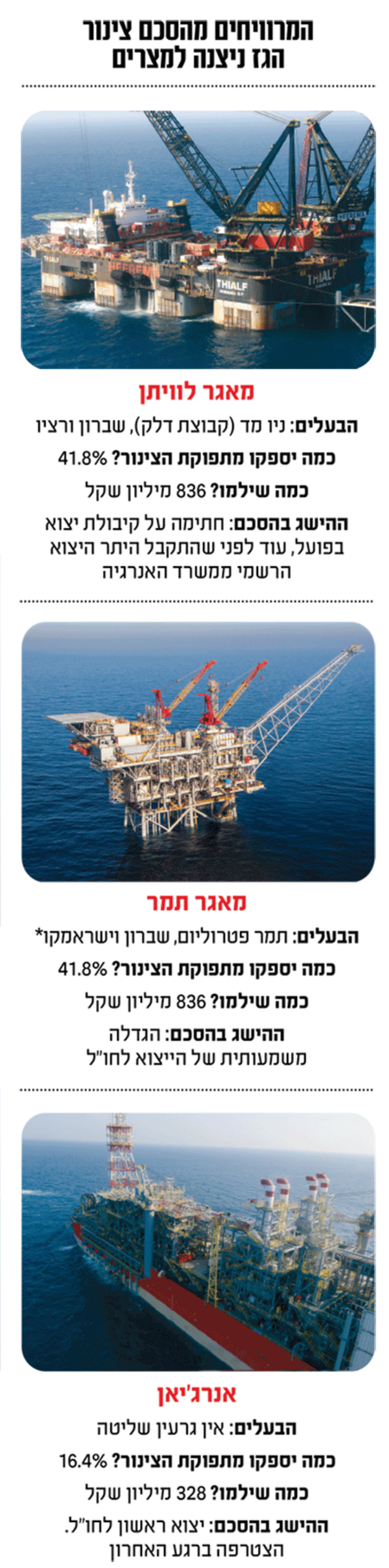 ביום שישי, ההסכם סוף סוף נסגר, וכל היצואנים חתמו עליו. בנוסף למימון ההקמה, היצואנים ישלמו לנתג"ז (החברה הממשלתית המנהלת את הפרויקט) גם דמי שימוש על הגז שהם יעבירו בו בפועל. כך, החברה הממשלתית צפויה להכניס לאורך חיי הצינור כמיליארד שקל. אגב, הרווח שתגזור המדינה מהמיזם היה הסיבה המרכזית לחילוקי הדעות מאחורי 5 הדחיות האחרונות. עיקר היצוא כנראה יגיע לידי החברה המצרית Blue Ocean Energy שקונה את הגז הישראלי.