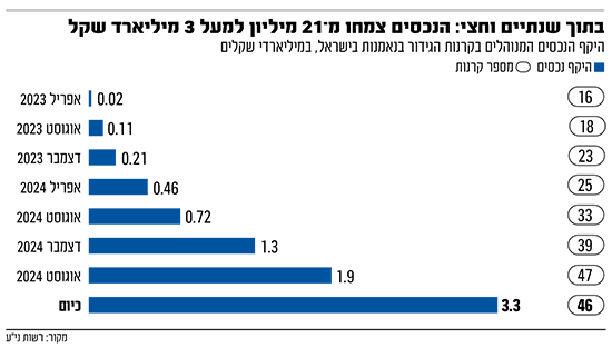 הענף, כאמור, צמח במהירות. אם באפריל 2023 פעלו בסך־הכול 16 קרנות שניהלו 21 מיליון שקל, כיום פעילות בו 46 קרנות המנהלות מעל שלושה מיליארד שקל. אלא שבענף חוששים מחוסר הוודאות לגבי העתיד ומזהירים שהגידול ייעצר, כי לקוחות לא יחששו לשים את כספם במוצר שעשוי להסתבך.