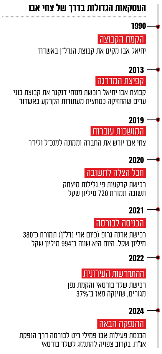 עד לפני שש שנים, שמה של משפחת אבו היה מוכר בעיקר בסצנת הנדל"ן של אשדוד, שם התבססה אימפריה מקומית שהקים לפני 40 שנה אב המשפחה יחיאל, אחת הדמויות המוכרות בעיר הנמל. אלא שבשנים האחרונות, תחת ניהולו של בנו צחי, קנתה לעצמה האימפריה המשפחתית שם גם בזירה הארצית, והיא חולשת כיום על שלוש חברות ציבוריות ושורה ארוכה של פעילויות נדל"ן פרטיות, ששוויין מוערך במיליארדי שקלים.