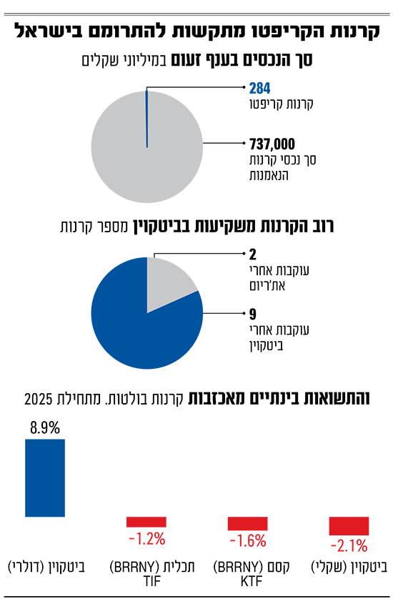 אבל כשהמהפכה ניסתה לעשות עלייה, היא גילתה מציאות אחרת לגמרי. בשלהי השנה שעברה איפשרה רשות ניירות ערך לקרנות הסל המקומיות להתחיל לעקוב אחר מטבעות הקריפטו המרכזיים. המטרה הייתה להקל על חיי המשקיעים ולאפשר להם חשיפה למטבעות הללו מבלי להסתבך עם ארנק דיגיטלי ומסחר בפלטפורמות ייעודיות. או במילים פשוטות - להכניס את הקריפטו למיינסטרים, כפי שקרה באמריקה. היום, כבר כמעט שנה שקרנות עוקבות ביטקוין ואת'ריום פועלות בארץ, אבל הן בקושי מצליחות לגייס משקיעים. עד כה הושקו בישראל 10 קרנות סל העוקבות אחרי המטבעות הדיגיטליים ועוד קרן נאמנות אקטיבית אחת. יחד, הן חולשות כיום על נכסים בשווי של 284 מיליון שקל בסה"כ - פרומיל (4 אלפיות האחוז) מהיקף הנכסים בענף קרנות הנאמנות העומד כיום על 737 מיליארד שקל.