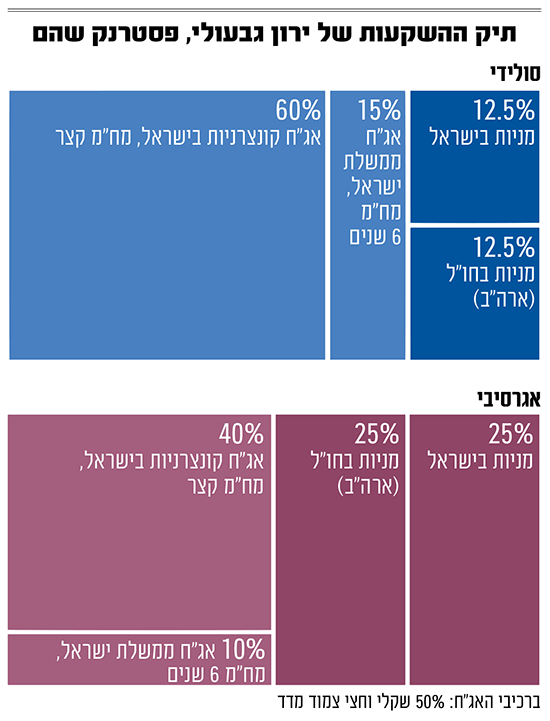 כשאנחנו מבקשים מגבעולי לבנות תיק השקעות הוא ממליץ למשקיע סולידי על הקצאה של 25% למניות, בחלוקה שווה בין ישראל והעולם (בעיקר ארה"ב). 15% מהתיק יוקצה לאג"ח ממשלתי ישראל במח"מ של 6 שנים ואילו את החלק המרכזי ־ 60% מהתיק ־ הוא ממליץ להשקיע באג"ח קונצרניות בישראל, "בעיקר בדירוגים גבוהים כמו אג"ח של בנק לאומי, הפניקס, עזריאלי ואחרות, במח"מ קצר יותר. המרווחים בין האג"ח הקונצרניות לממשלתיות נמוך אבל גם אם הוא ייפתח (כלומר תהיה פגיעה באג"ח הקונצרניות, נ"א) פתיחת המרווח תהיה מצומצמת. ומעבר לכך צריך לזכור שאנחנו עדיין בתהליך של ירידת ריבית, כך שהכיוון הוא רווחי הון ולא הפסדים".