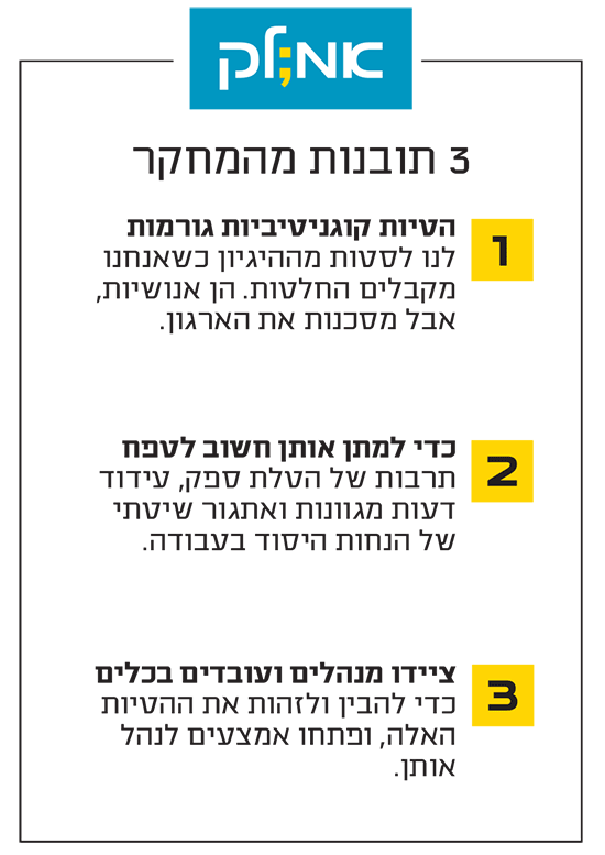 ועדת תורג'מן, שבחנה את תחקירי צה"ל על האירועים שקדמו ל־7 באוקטובר, חשפה שורה של כשלים מערכתיים בתהליך קבלת ההחלטות. רבים מהם נבעו מהטיות קוגניטיביות, שמופיעות יותר בתנאי שיבוש ואי-ודאות. הטיות כאלה הן אינהרנטיות למערכות שונות, ולכן ההבנה שלהן יכולה לסייע גם למנהלים במגזר העסקי, שפועלים בסביבות מורכבות.