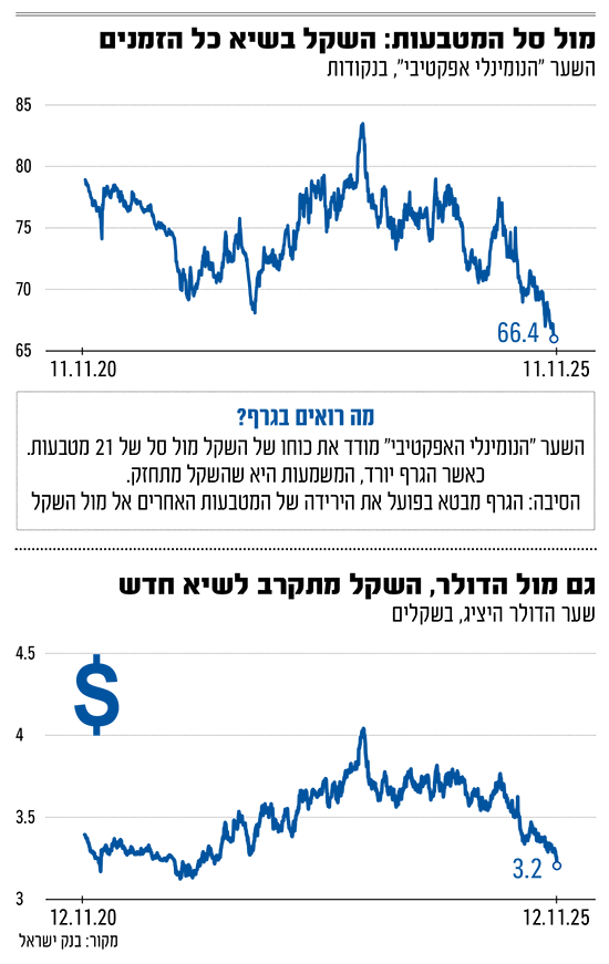על רקע ההסכם בעזה והאופטימיות בוול סטריט, השקל מגיע לרמות שיא חדשות. שער הדולר היציג ירד בכחצי אחוז ונעמד על 3.2 שקלים - הנמוך ביותר זה 3.5 שנים. תמונה דומה נרשמה גם מול האירו: שערו היציג ירד ב־0.57% לרמה של 3.7 שקלים. זהו השער הנמוך ביותר זה שלוש שנים. אלא שהשקל חזק אפילו יותר ממה ששני הנתונים הללו מלמדים.