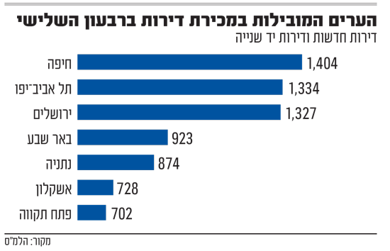 ירושלים מצויה במקום השלישי במספר העסקאות עם 1,327 עסקאות על אף קפיצה של 45% במספר הדירות החדשות שנמכרו בה (436 עסקאות ברבעון שלישי), ואילו למקום הרביעי הגיעה באר שבע, שבה נמכרו בסך הכל 923 דירות.