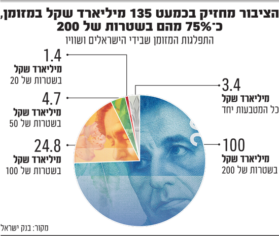 כבר בפברואר 2025 פורסם בגלובס שעל פי נתוני בנק ישראל, נפח שטרות ה־200 במחזור הצטמצם ב־7%, בעיקר לטובת שטרות של 100 שקל. מאז, למרות שבכל שנה לפני כן כמות המזומן בידי הציבור גדלה משמעותית, כמות המזומן הכוללת נשארה במקום. ולמעשה, כמות המזומן במשק מעולם לא עברה מאז את השיא של ספטמבר 2024. ספציפית, שווי שטרות ה־200 הצטמצם מכ־106 מיליארד שקל לכ־100 מיליארד שקל. זאת לעומת עלייה מ־98 מיליארד שקל ל־106 מיליארד בשנה קודם לכן.