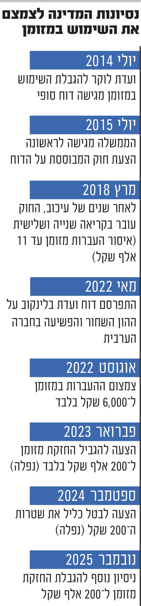 בפברואר 2023, בתחילת כהונתה של הממשלה הנוכחית, הוגשה הצעה לצמצם את החזקת המזומן ל־200 אלף שקל בלבד. בסופו של דבר הצעה זו נפלה, כאשר על פי גורמים המעורים בנושא זאת בשל התנגדות המפלגות החרדיות. כעת, יותר משנתיים לאחר מכן, הצעה זו עולה שוב - אך עדיין לא ברור מה סיכוייה לעבור מכיוון שאותן מפלגות עם אותם חברי כנסת יידרשו כדי להעביר את התקציב הנוכחי, שבמילא מוטל בספק בשל הקשיים להעברת חוק הגיוס.