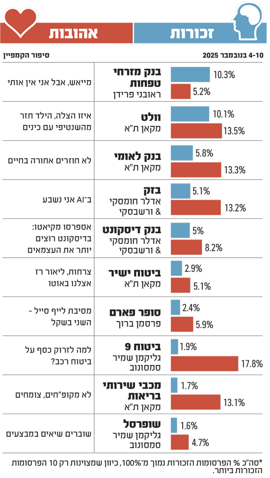 במקום הראשון בזכירות, גם השבוע, נמצא בנק מזרחי טפחות - שגייס לשורותיו את השחקנית עדי חבשוש לצד הפרזנטורים הקבועים, דביר בנדק וחן אמסלם. חבשוש מבצעת גרסה מעודכנת לשיר "אין אותי" של אושר כהן, במטרה להדגיש את המיתוג הקבוע של הבנק: מענה אנושי קבוע, לא מתחלף ולא דיגיטלי. כמו בפרסומת הקודמת עם נסרין קדרי, גם כאן מופיעים צבעי הבנקים המתחרים בצורה מעומעמת, שמדגישה את ההבדל בינם לבין מזרחי טפחות.