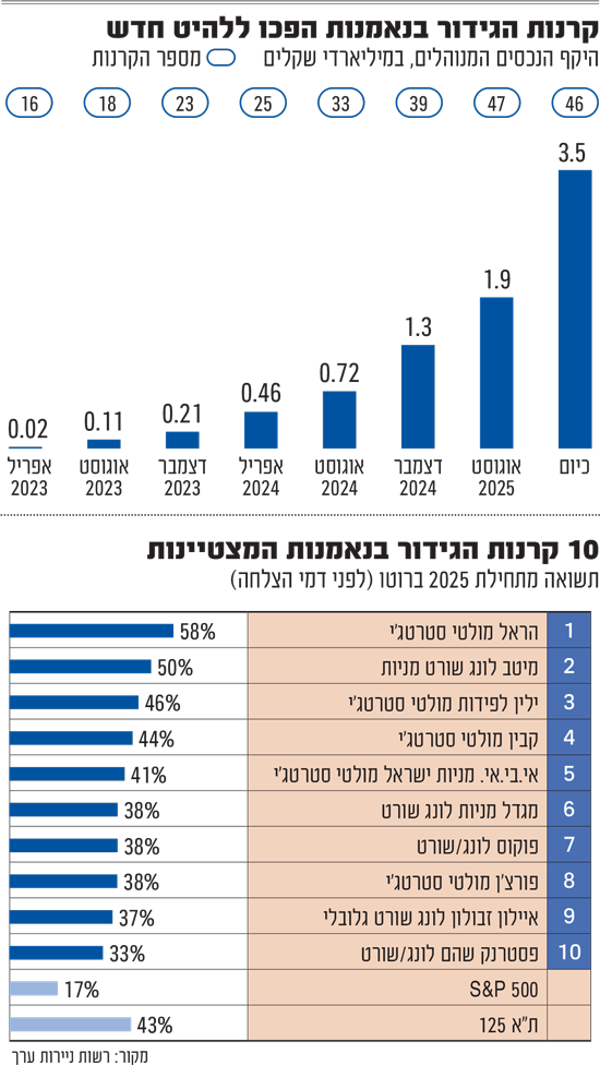 גם התשואות שמציגות הקרנות הללו תורמות לפופולריות ההולכת וגדלה שלהן. מתחילת השנה רשמו 10 קרנות הגידור בנאמנות הטובות ביותר תשואה של 30% עד כמעט 60%. השיאנית, הראל מולטי־סטרטג'י עלתה ב־58% (לעומת עלייה של 43% במדד ת"א 35) והיקף נכסיה כבר עומד על קרוב לחצי מיליארד שקל, הקרן המנייתית הגדולה בענף.