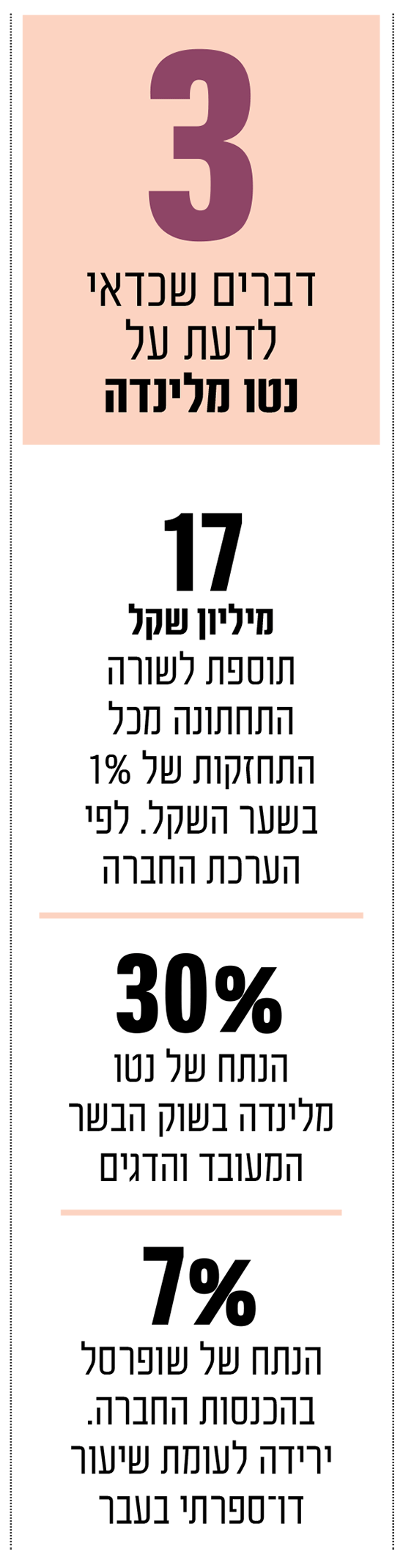 נטו מלינדה היא ספקית המזון השלישית בגודלה לשוק המקומי. חברת האם נטו אחזקות מחזיקה בכ־43% מההון, והקבוצה פועלת כ"שחקן מלא" שמציע סל רחב של מוצרים לרשתות המזון, לקצביות פרטיות, למסעדות ולמלונות, וגם לצרכן הפרטי עם מותגים שמוכרים לכל בית. "טיבון ויל" מזוהה עם בשר מעובד, "דלידג" מובילה בדגים טריים וקפואים, "ויליגר" מוכרת בשימורים ומוצרי מדף, "שלושת האופים" בולטים במקפיאי רשתות המזון ו־RICH מתמקדת במוצרי קצפת ומעדנים, לצד מותג Devazza בתחום הסטייקים והבשר האיכותי. מאחורי המותגים עומדת תשתית יצרנית רחבה - מפעל לבשר מעובד, אתר ייצור לדגים, מפעל שימורים ומפעל מאפים קפואים - כולם פזורים בכמה מוקדים בארץ.