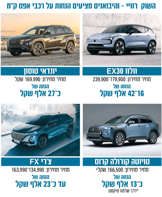 עוד דוגמאות: וולבו פתחה בהרצליה אולם תצוגה ייעודי לרכבי "אפס קילומטר" של המותג ומוכרת את הדגם החשמלי EX30 בהנחות של כ־16 אלף עד 42 אלף שקל מהמחירון, כך שהמחירים מתחילים ב־165 אלף שקל. דגם פופולרי כמו יונדאי טוסון נמכר בהנחה של כ־27 אלף שקל באפס קילומטר ואפילו טויוטה קורולה קרוס מהמודל היוצא מוצעת באפס קילומטר דרך שלמה סיקס (ולא דרך היבואן הרשמי) בהנחה של כ־13 אלף שקל - ללמדנו שגם דגמים של טויוטה יכולים להימכר במסגרת מבצעי אפס ק״מ. ואלה רק כמה דוגמאות מתוך עשרות. בשבועות האחרונים, ראינו גם קמפיינים פרסומיים ייעודיים למשיכת לקוחות לאפס קילומטר.
