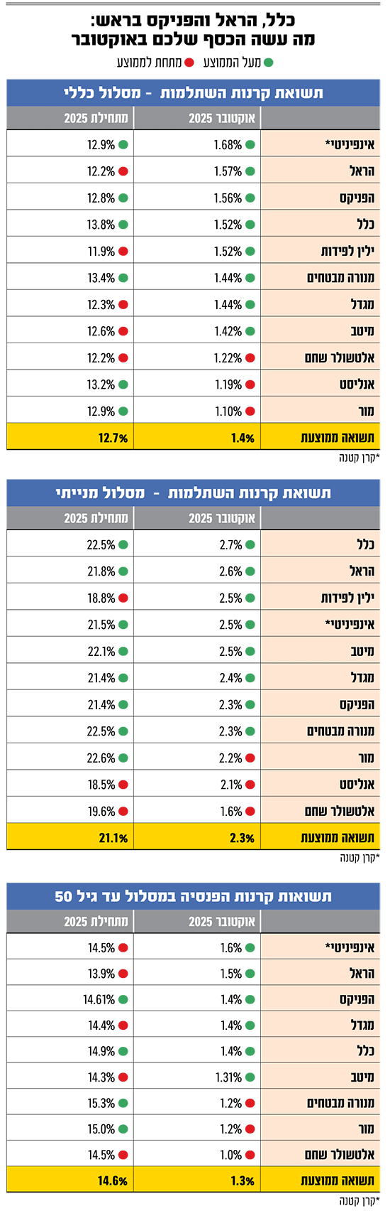 באשר לחודש אוקטובר במסלול המנייתי, כלל ביטוח ראשונה עם 2.7%, אחריה נמצאת הראל עם תשואה של 2.6% ואת המקום השלישי חולקות ילין לפידות, אינפיניטי ומיטב עם תשואה של כ־2.5% כל אחת.