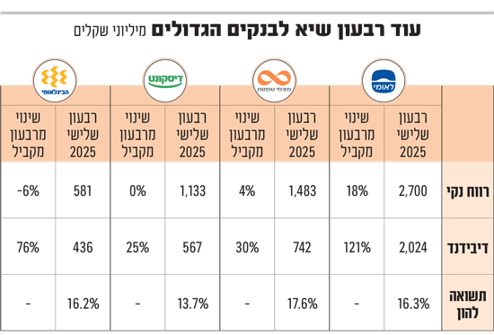 מאחר ששני מדדי המחירים לצרכן האחרונים היו נמוכים ביחס לתחזיות, צפויה שחיקה ברווחיות ברבעון האחרון. ועדיין, חמשת הבנקים הגדולים עשויים לסכם את השנה ברווח נקי כולל של מעל ל-30 מיליארד שקל, יותר מרווחי השיא שהציגו ב-2024 (29.5 מיליארד שקל).