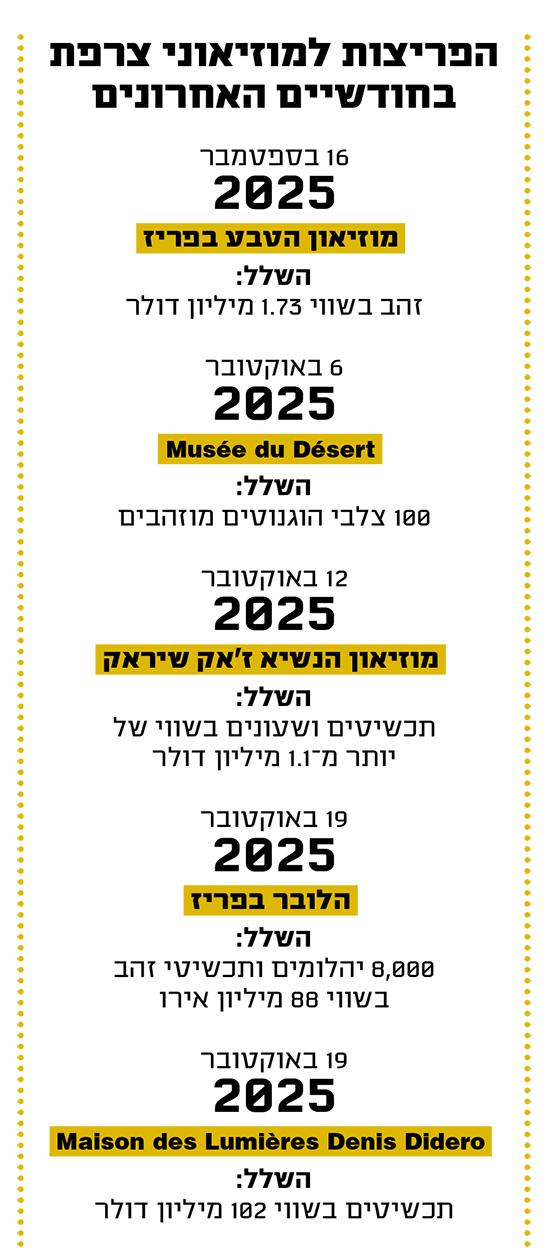 צרפת לא לבד. חוץ ממנה נרשמו באירופה עוד ארבע פריצות למוזיאונים בשנה האחרונה. הגל הזה מגיע על רקע הזינוק במחירי הזהב ומתכות אחרות, והמוזיאונים ביבשת הפכו לטרף קל עבור גנבים. לרוב הם גם מאובטחים פחות מיעדים מסורתיים, כמו בנקים, ומצוידים במצלמות ובמערכות אזעקה מיושנות שמתקשות להתריע בזמן למשטרה. שומרי המוזיאונים אינם חמושים בדרך כלל, ויצירות יקרות רבות מוצגות בוויטרינות פגיעות - במקום להישמר בכספות.