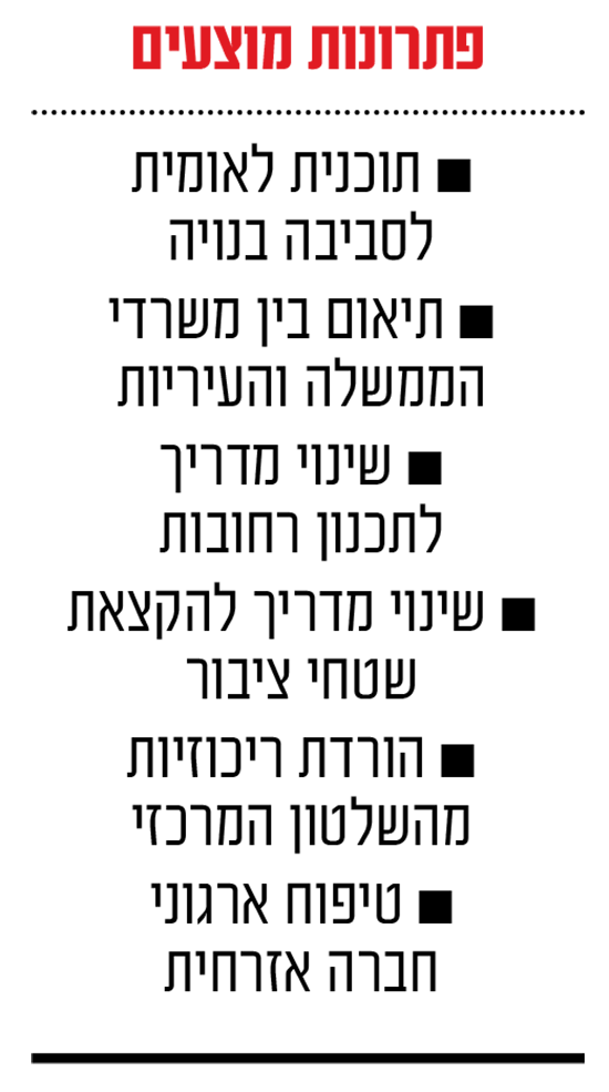 "נוסף לכך, צריך לתקן מדריכים קיימים ושני הגדולים שבהם הם המדריך לתכנון רחובות והמדריך להקצאת שטחי ציבור. אלו שתי אבנים רגולטוריות וצריך להוריד הרבה מאוד מסמכויות המדינה הריכוזית כל־כך לרשויות מטרופוליניות ולרשויות מקומיות כדי לייצר מגוון ולא שבלונה.