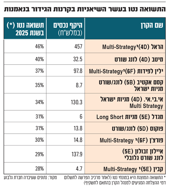 השיאנית היא קרן הנאמנות הראל מולטי סטרטג'י, שהיועץ שלה הוא כוכב מענף קרנות הגידור המסורתיות, מיכה מלכה שייסד את קרן טוליפ. הקרן רשמה תשואה מצטברת של 46.4% בשנת 2025. בטבלת ה"ברוטו" מדובר ב-58.4%.
