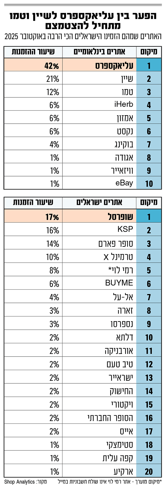 האתרים הסיניים ממשיכים לבלוט בפסגת אתרי הקניות הבינלאומיים, כאשר עלי אקספרס מוביל במקום הראשון עם נתח של 42% מכלל ההזמנות באתרים המובילים. עם זאת, החודש הוא רושם ירידה קלה בהשוואה לחודש הקודם, והפער בינו לבין שיין וטמו הולך ומצטמצם.