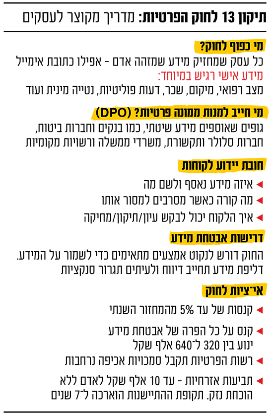 בפן החיובי, הרפורמה הזו מיישרת קו עם שורה של מדינות מערביות ומביאה לעמידה בתקני פרטיות גלובליים מחמירים. בצד השני של המטבע, נחתו כמעט על כל ארגון בישראל חובות רגולטוריות נרחבות, שעלות הטמעתן יכולה להגיע למיליוני שקלים. הסנקציות מחמירות במיוחד - ויכולות להגיע לאחוזים נכבדים מהמחזור השנתי של בית העסק. עבור עסקים שמתקיימים על שולי רווח נמוכים, קנסות אלו יכולים להיות מכה אנושה.