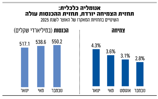 לפני שבועיים, במסיבת העיתונאים של האוצר להצגת עקרונות הצעת תקציב 2026, הודיע הכלכלן הראשי אברמזון על הפחתת תחזית הצמיחה ל־2025, ל־2.8% תוצר במקום 3.1%. העדכון נעשה בעקבות רבעון שני שניחלש בנתוני הצמיחה, שכלל בתוכו את מבצע "עם כלביא".