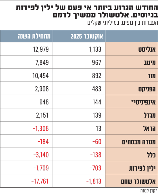 החברה השלישית שהמשיכה לאבד כספים גם בחודש שעבר היא חברת הביטוח כלל, שיצאו ממנה כספים בהיקף של 138 מיליון שקל ולא פחות מ-3.1 מיליארד שקל מתחילת השנה. אלא שבמקרה של כלל, נדמה כי בינתיים היא נמצאת במגמת שיפור. בחודשים האחרונים מגמת יציאת הכספים מאטה.