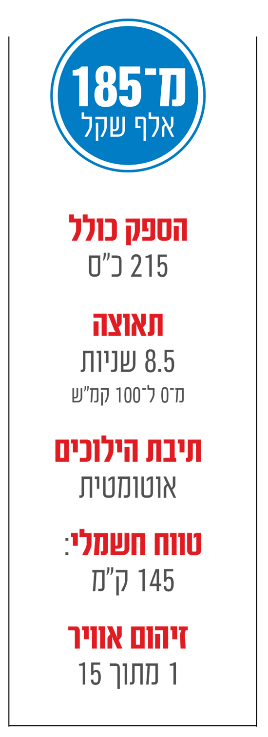 אבל כשהסוללה נמצאת מתחת לרף טעינה של 25% או תחת לחץ לא מתון כמו בעת האצה בעלייה, פעולת המנוע מורגשת אם כי רמת הרעש נותרת סבירה. החברה נוקבת בטווח כולל משולב של עד 970 ק"מ (WLTP) לפני עצירה לטעינה/תדלוק. נראה שעם רגל מתונה אפשר להתקרב לכך.