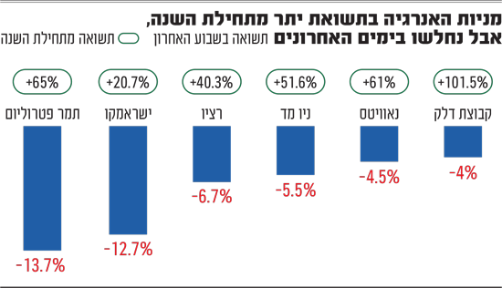 כך למשל, מניית תמר פטרוליום ירדה בכ־14% בשבוע האחרון, ישראמקו ב־13%, רציו בכ־6%, ניו-מד בכ־5% וקבוצת דלק ב־4% - כמעט כולן הניבו תשואות פנומנליות מתחילת השנה. פרט לישראמקו שעלתה "רק" ב־20%, שאר המניות ברשימה זינקו בשיעורים שנעים בין 40% למעל 100%. מה גרם לירידות האחרונות והאם הן מבשרות על שינוי מומנטום או שמדובר במגמה רגעית? גלובס עושה סדר.