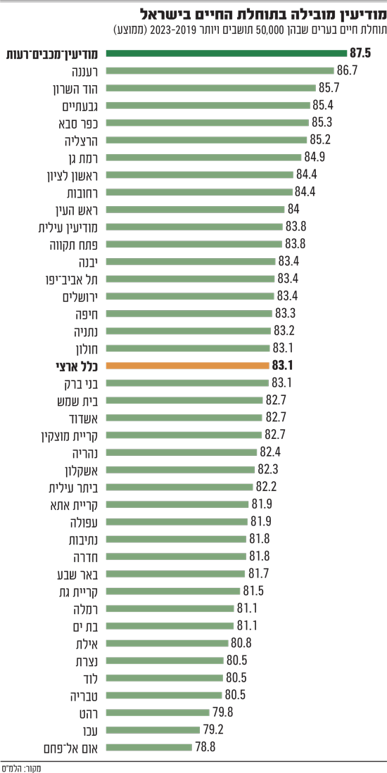 על פי דוח הלמ"ס, העיר עם תוחלת החיים הגבוהה ביותר בארץ היא מודיעין, עם 87.5 שנים, ואילו באום אל פאחם נרשמה תוחלת החיים הנמוכה ביותר – 78.8 שנים ● גם שיעורי הזכאות לתעודת בגרות היו גבוהים יותר בערים החזקות כלכלית: בגבעתיים ובמודיעין הוא הגיע ליותר מ-90%, בהרצליה, הוד השרון ורעננה הוא הגיע לכ-90%